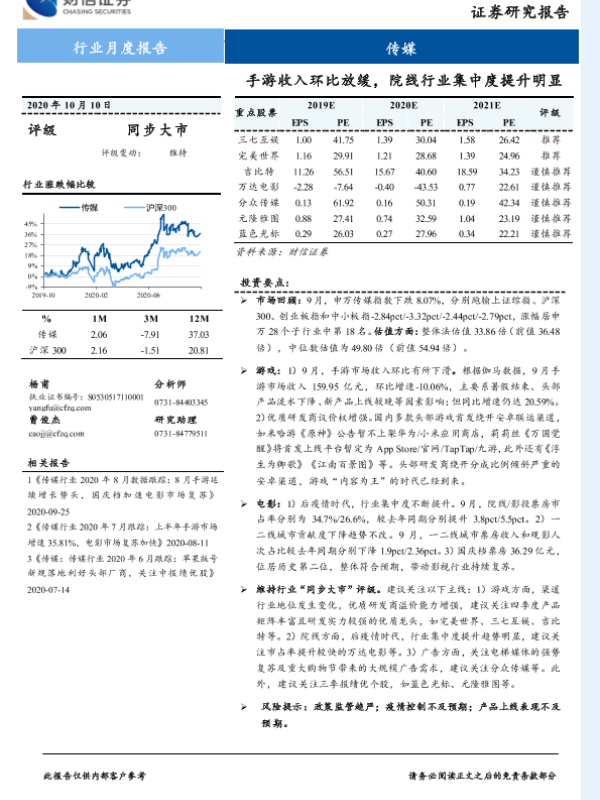 【财信证券】【20201010】20201010-财信证券-传媒行业月度报告:手游收入环比放缓,院线行业集中度提升明显-11页 行业研究
