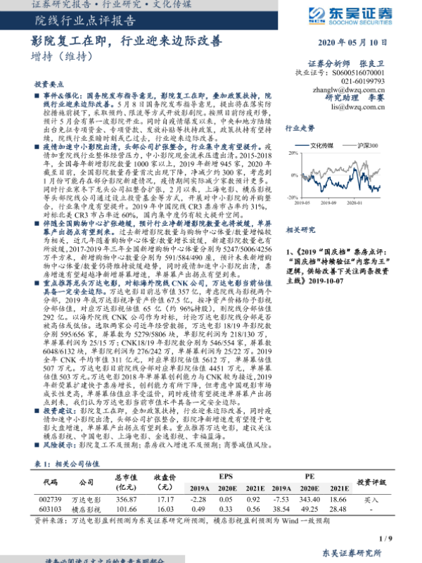 【东吴证券】【20200510】20200510-东吴证券-院线行业点评报告:影院复工在即,行业迎来边际改善-9页 行业研究