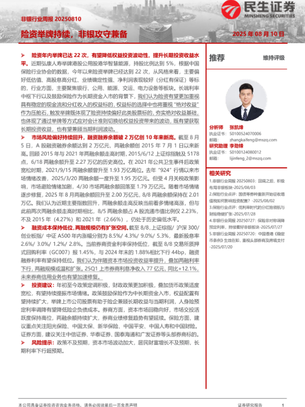 【民生证券】【20250810】险资举牌持续,非银攻守兼备-13页 证券期货研究报告