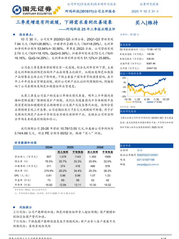 【国元证券】【202510】三季度增速有所放缓,下游需求看到改善迹象——珂玛科技 25年三季报业绩点评-5页 证券期货研究报告