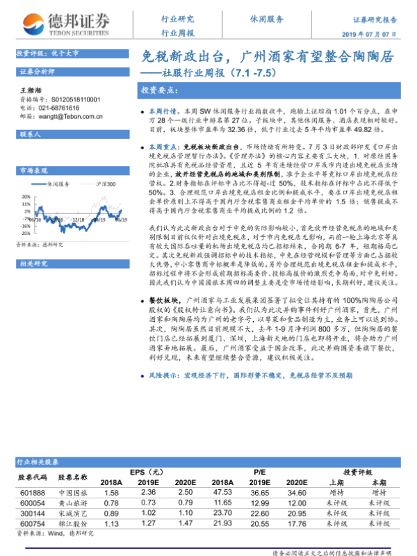 【德邦证券】【20190707】社服行业周报:免税新政出台,广州酒家有望整合陶陶居-8页 行业研究