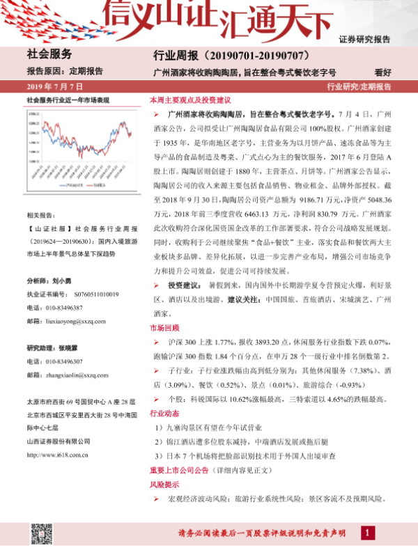 【山西证券】【20190707】社会服务行业周报:广州酒家将收购陶陶居,旨在整合粤式餐饮老字号-9页 行业研究