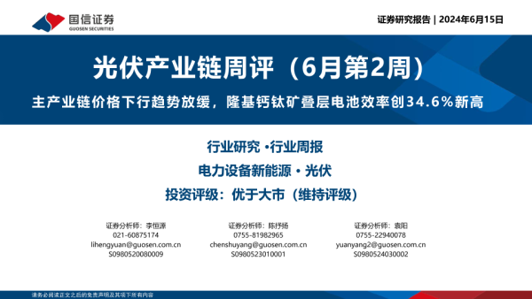 【国信证券】【20240615】20240615-国信证券-光伏产业链周评(6月第2周):主产业链价格下行趋势放缓,隆基钙钛矿叠层电池效率创34.6%新高-18页 行业研究