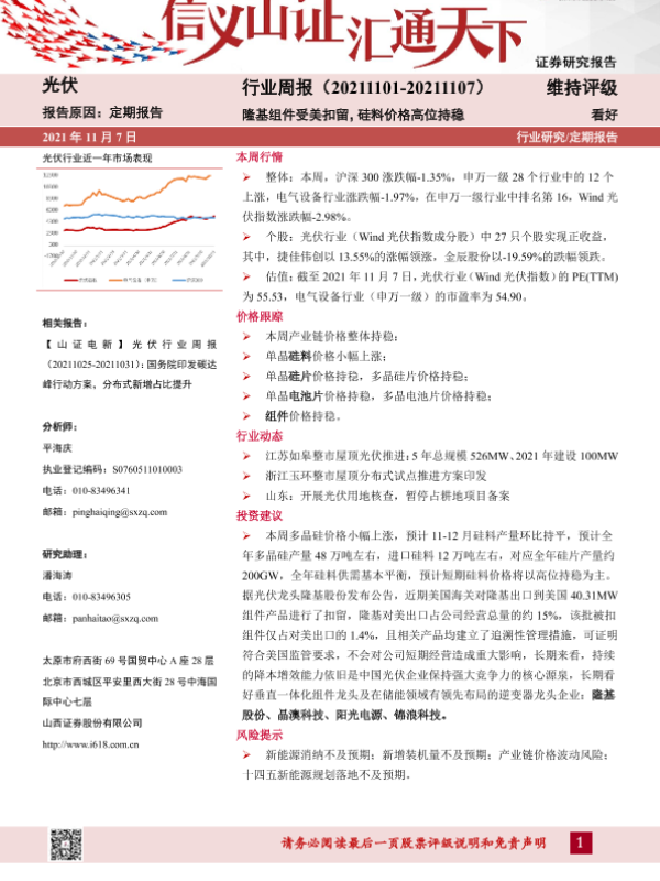 【山西证券】【20211107】光伏行业周报:隆基组件受美扣留,硅料价格高位持稳-10页 行业研究