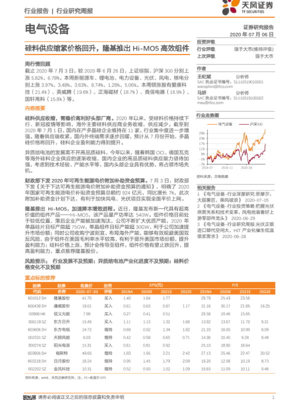 【天风证券】【20200706】电气设备行业研究周报:硅料供应缩紧价格回升,隆基推出Hi-MO5高效组件-19页 行业研究
