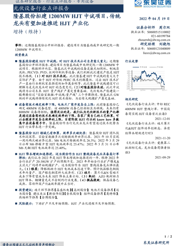 【东吴证券】【20220419】光伏设备行业点评报告:隆基股份拟建1200MW HJT中试项目,传统龙头有望加速推进HJT产业化-2页 行业研究