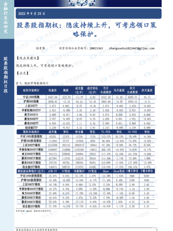 【国泰君安期货】【20220923】股票股指期权:隐波持续上升,可考虑领口策略保护-26页 行业研究