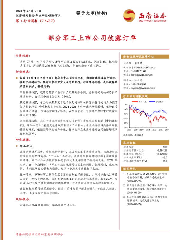 【西南证券】【20240707】20240707-西南证券-军工行业周报:部分军工上市公司披露订单-10页 行业研究