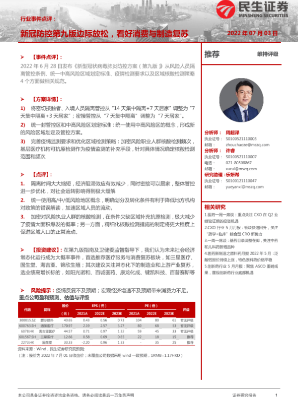 【民生证券】【20220703】新冠防控第九版边际放松,看好消费与制造复苏-2页 行业研究