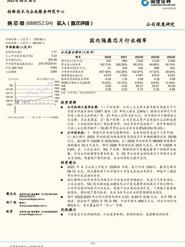 【开源证券】【20220429】纳芯微-688052.SH-公司首次覆盖报告:立足隔离芯片技术优势,拓展模拟芯片产品版图-23页 公司研究