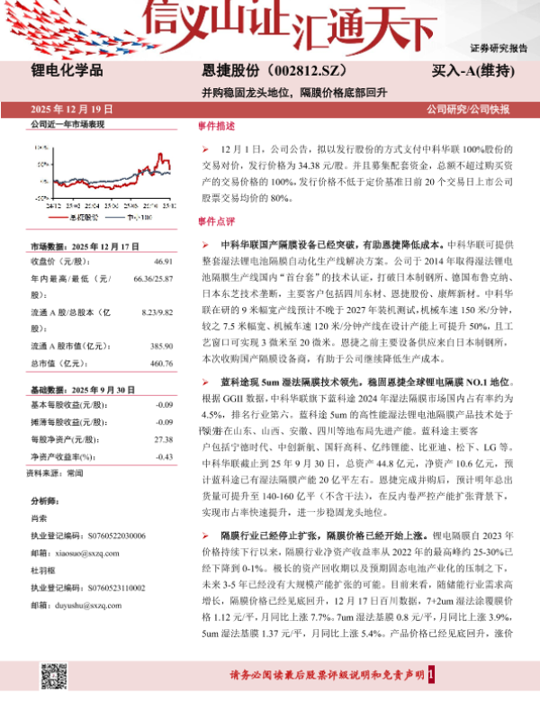 【山西证券】【202512】并购稳固龙头地位,隔膜价格底部回升-5页 证券期货研究报告
