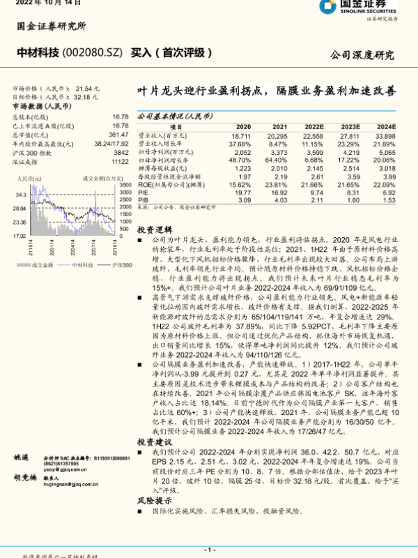 【国金证券】【20221014】20221014-国金证券-中材科技-002080.SZ-叶片龙头迎行业盈利拐点,隔膜业务盈利加速改善-21页 行业研究