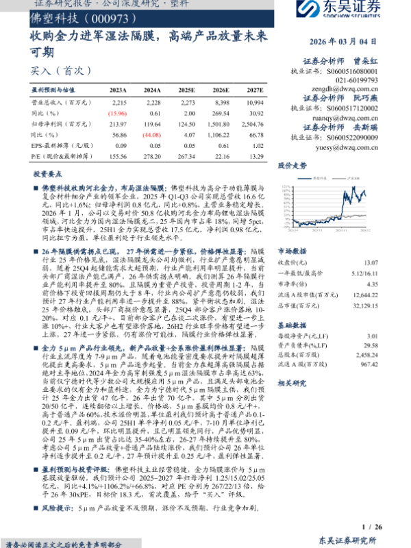 【东吴证券】【202603】收购金力进军湿法隔膜,高端产品放量未来可期-26页 证券期货研究报告