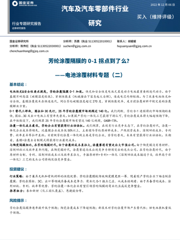 【国金证券】【20221206】汽车及汽车零部件行业研究:电池涂覆材料专题(二)-芳纶涂覆隔膜的0-1拐点到了么?-17页 行业研究