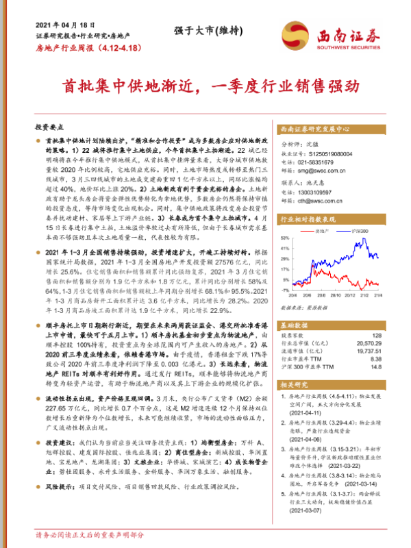 【西南证券】【20210418】房地产行业周报:首批集中供地渐近,一季度行业销售强劲-14页 行业研究