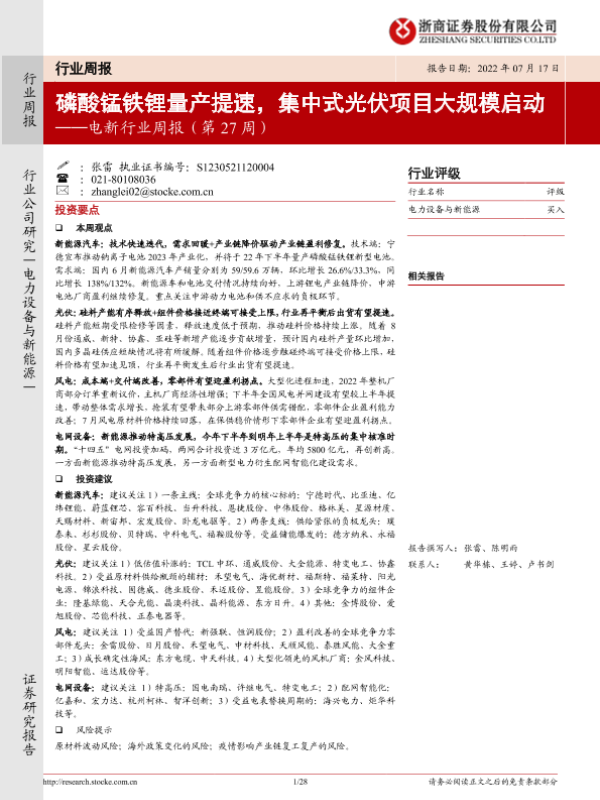 【浙商证券】【20220717】电新行业周报(第27周):磷酸锰铁锂量产提速,集中式光伏项目大规模启动-28页 行业研究