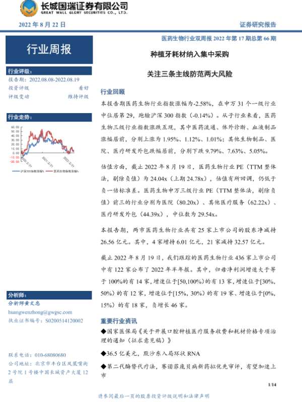 【长城国瑞证券】【20220822】医药生物行业双周报:种植牙耗材纳入集中采购 关注三条主线防范两大风险-14页 行业研究