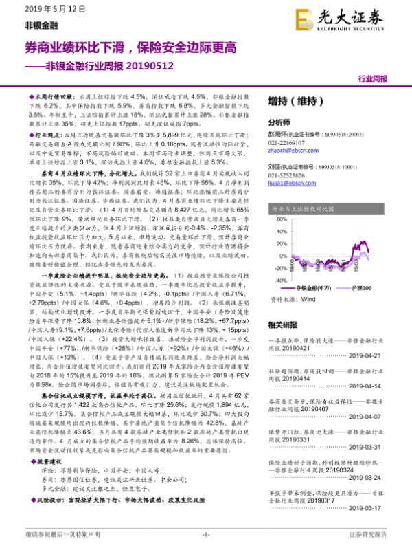 【光大证券】【20190512】非银金融行业周报:券商业绩环比下滑,保险安全边际更高-17页 行业研究