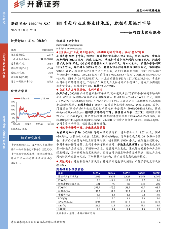 【开源证券】【20250829】坚朗五金-公司信息更新报告-H1尚处行业底部业绩承压 积极布局海外市场-4页 证券期货研究报告