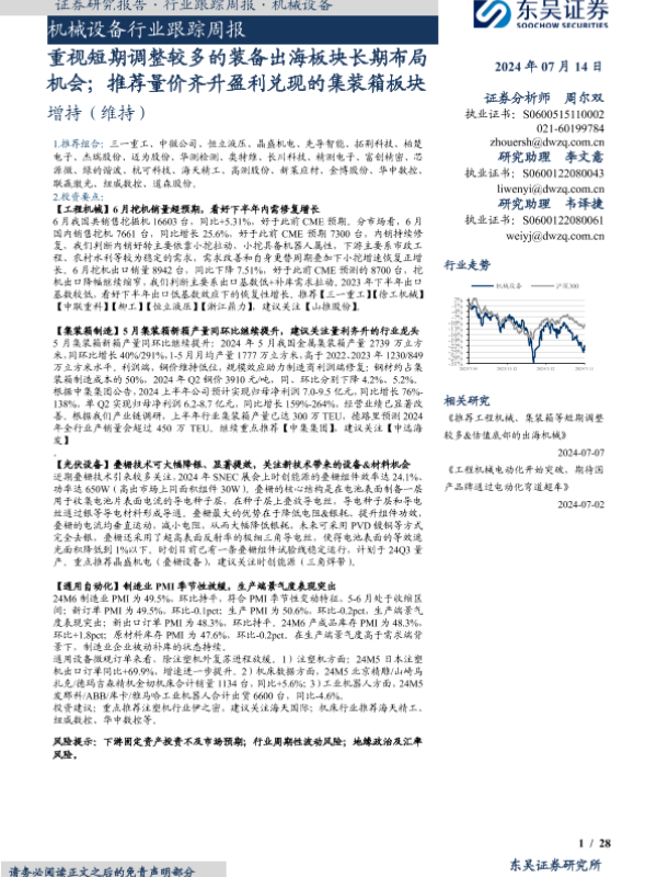 【东吴证券】【20240714】20240714-东吴证券-机械设备行业跟踪周报:重视短期调整较多的装备出海板块长期布局机会;推荐量价齐升盈利兑现的集装箱板块-28页 行业研究