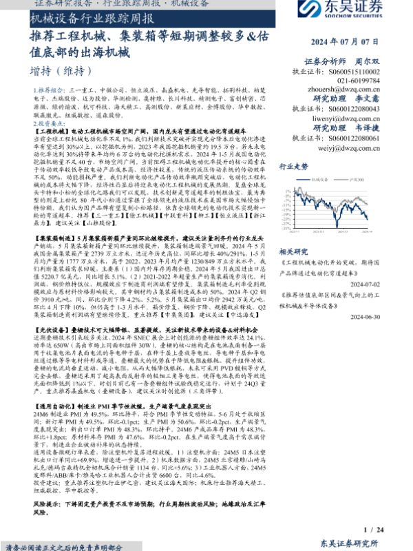 【东吴证券】【20240707】20240707-东吴证券-机械设备行业跟踪周报:推荐工程机械、集装箱等短期调整较多&估值底部的出海机械-24页 行业研究