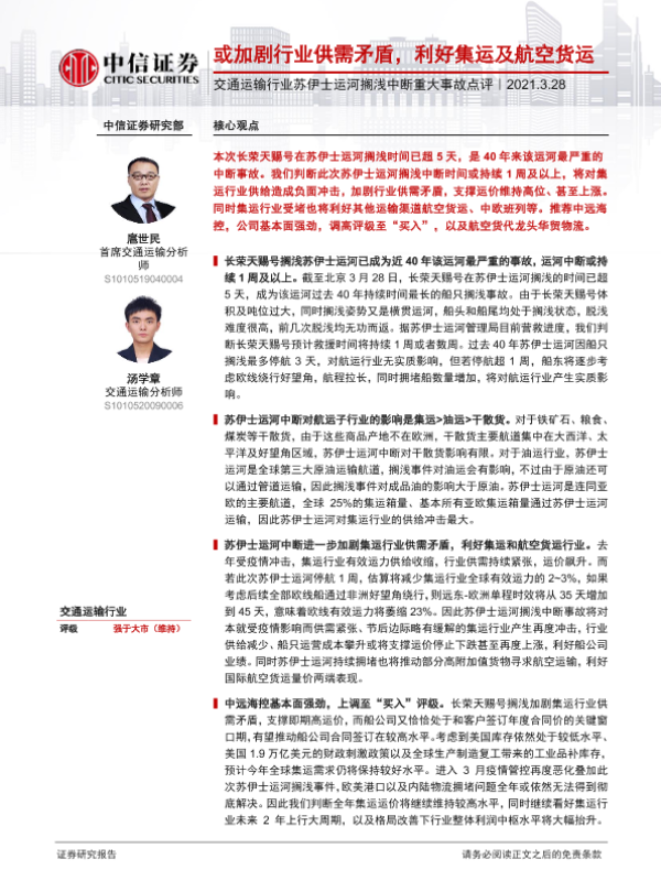【中金公司】【20210329】交通运输物流行业:运河堵塞或带动运价上涨,程度待观察-4页 行业研究