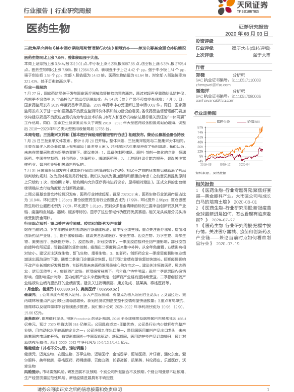 【天风证券】【20200803】医药生物行业研究周报:三批集采文件和《基本医疗保险用药管理暂行办法》相继发布——兼论公募基金重仓持股情况-21页 行业研究
