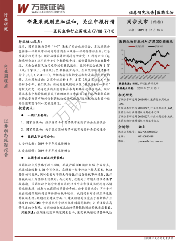 【万联证券】【20190715】医药生物行业周观点:新集采规则更加温和,关注中报行情-6页 行业研究