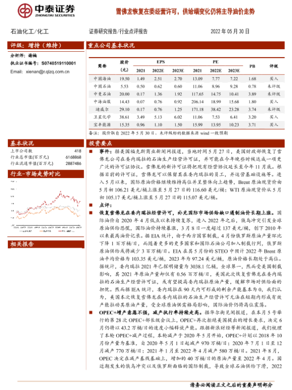 【中泰证券】【20220530】20220530-中泰证券-石油化工行业点评报告:雪佛龙恢复在委经营许可,供给端变化仍将主导油价走势-5页 行业研究