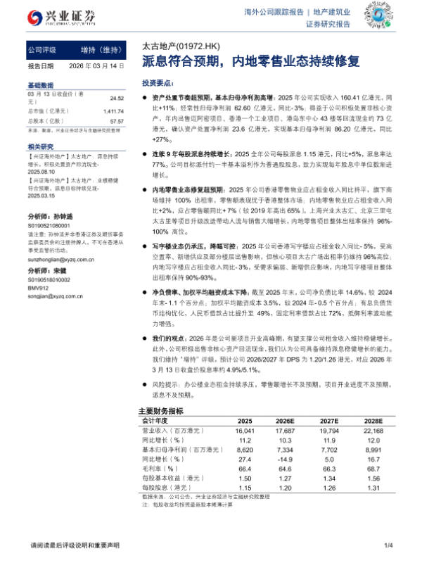 【兴业证券】【202603】太古地产:派息符合预期,内地零售业态持续修复-4页 公司研究