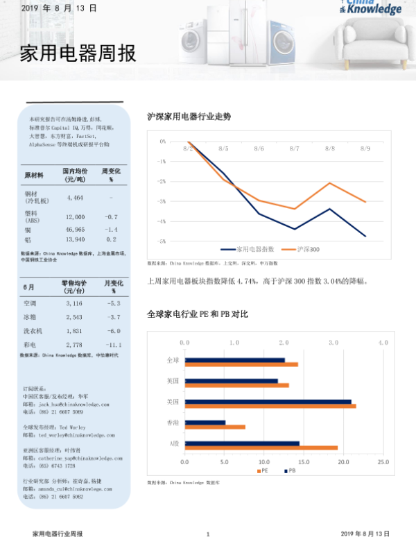 【China Knowledge】【20190813】20190813-China Knowledge-家用电器周报-12页 行业研究