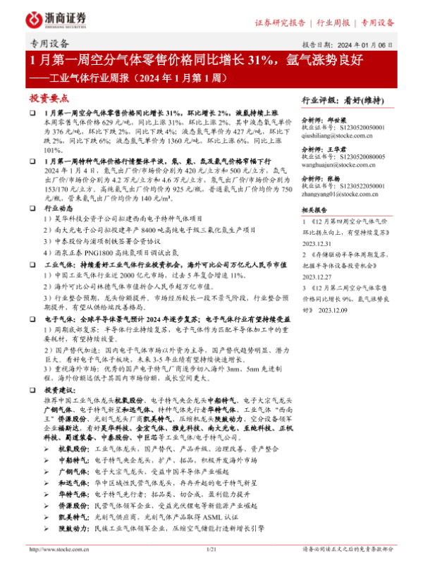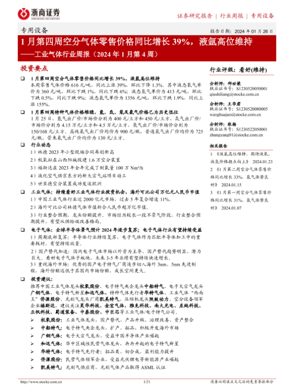 【浙商证券】【20240126】2024年1月第4周工业气体行业周报:1月第四周空分气体零售价格同比增长39%,液氩高位维持-21页 行业研究