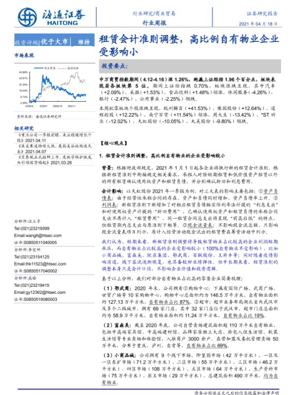 【海通证券】【20210418】商业贸易行业周报:租赁会计准则调整,高比例自有物业企业受影响小-7页 行业研究
