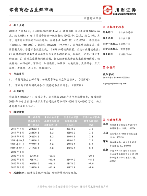 【川财证券】【20200714】消费行业日报:零售商抢占生鲜市场-3页 证券期货研究报告