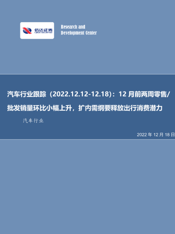 【信达证券】【20221218】汽车行业跟踪:12月前两周零售批发销量环比小幅上升,扩内需纲要释放出行消费潜力-19页 行业研究