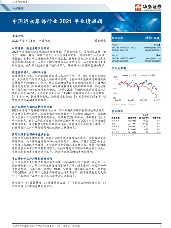 【华泰证券】【20220504】中国运动服饰行业2021年业绩回顾-18页 行业研究
