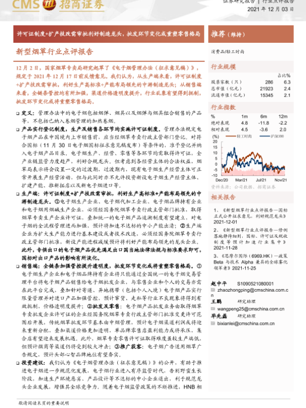 【海通证券】【20211203】新型烟草行业点评报告:许可证制度+扩产技改需审批利好制造龙头,批发环节变化或重塑零售格局-3页 证券期货研究报告