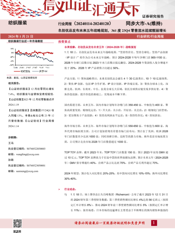【山西证券】【20240121】纺织服装行业周报:名创优品发布未来五年战略规划,361度23Q4零售流水延续靓丽增长-26页 行业研究