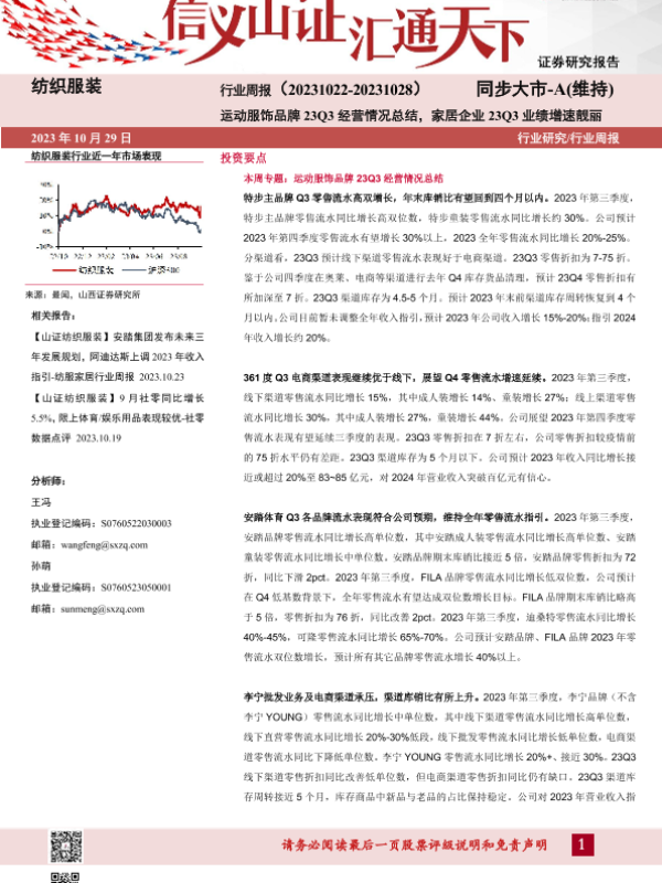 【山西证券】【20231029】纺织服装行业周报:运动服饰品牌23Q3经营情况总结,家居企业23Q3业绩增速靓丽-23页 行业研究