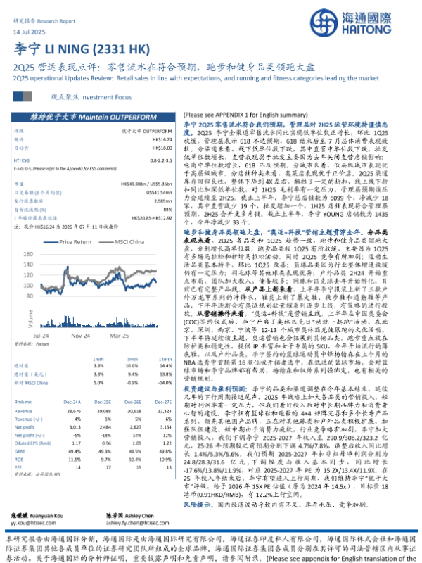 【海通国际】【20250714】2Q25营运表现点评:零售流水在符合预期,跑步和健身品类领跑大盘-12页 公司研究