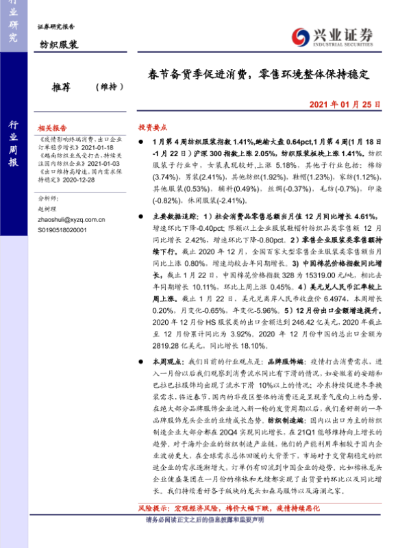 【兴业证券】【20210125】20210125-兴业证券-纺织服装行业周报:春节备货季促进消费,零售环境整体保持稳定-11页 行业研究