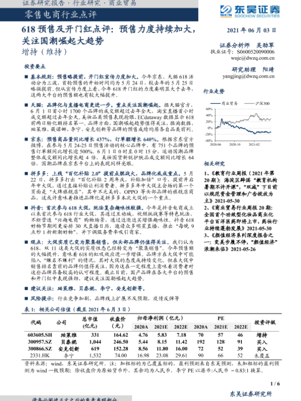 【东吴证券】【20210603】零售电商行业点评:618预售及开门红点评-6页 行业研究