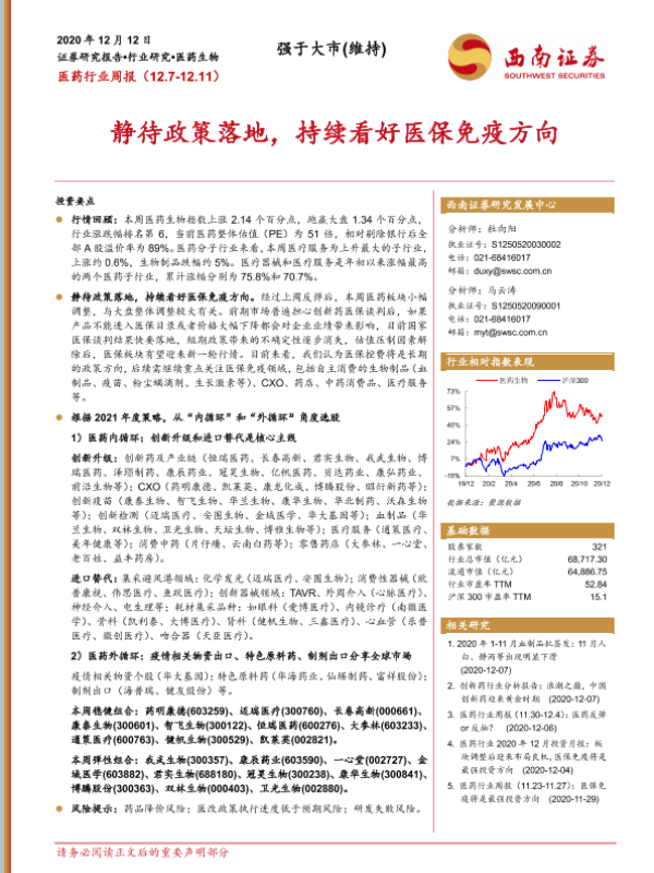 【西南证券】【20201212】医药行业周报:静待政策落地,持续看好医保免疫方向-22页 行业研究