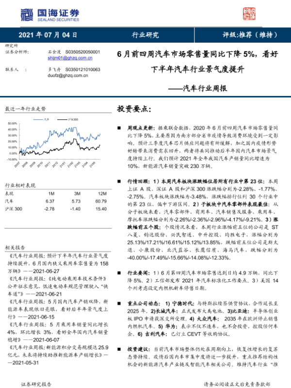 【国海证券】【20210704】20210704-国海证券-汽车行业周报:6月前四周汽车市场零售量同比下降5%,看好下半年汽车行业景气度提升-12页 行业研究