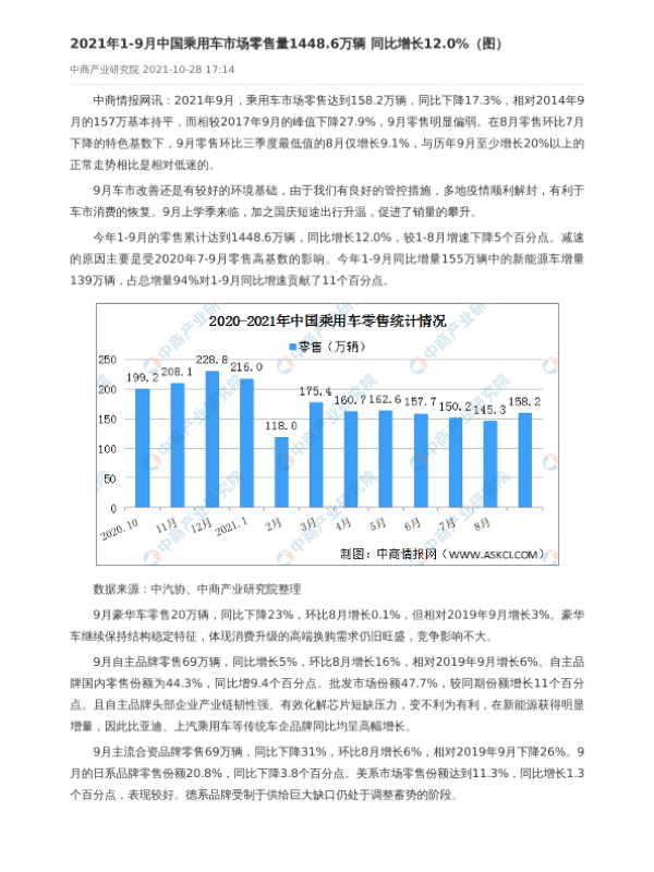 【中商产业研究院】【2021】2021年1-9月中国乘用车市场零售量1448.6万辆 同比增长12.0%-2页 市场调研