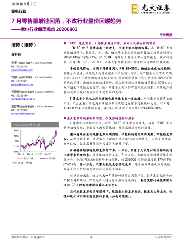 【光大证券】【20200802】家电行业每周观点:7月零售量增速回落,不改行业量价回暖趋势-5页 行业研究