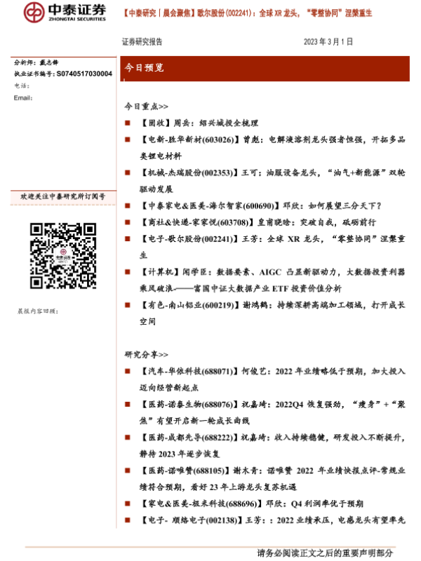 【中泰证券】【20230301】【中泰研究丨晨会聚焦】歌尔股份:全球XR龙头,“零整协同”涅槃重生-18页 行业研究