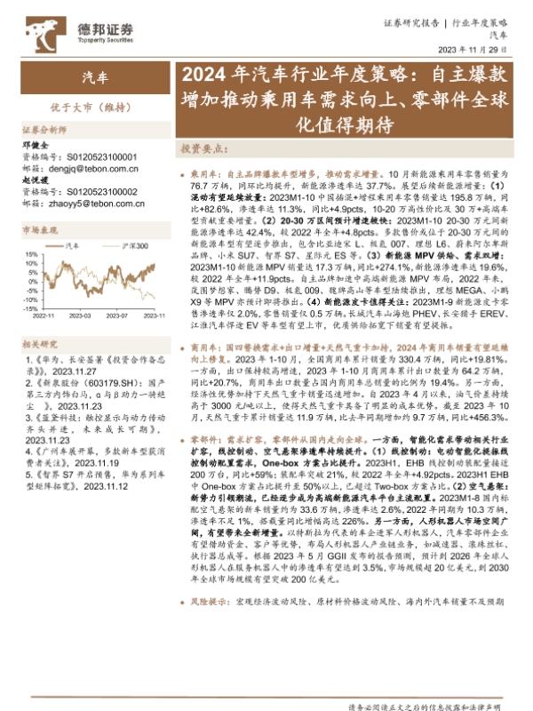 【德邦证券】【20231130】2024年汽车行业年度策略-自主爆款增加推动乘用车需求向上、零部件全球化值得期待-32页 行业研究