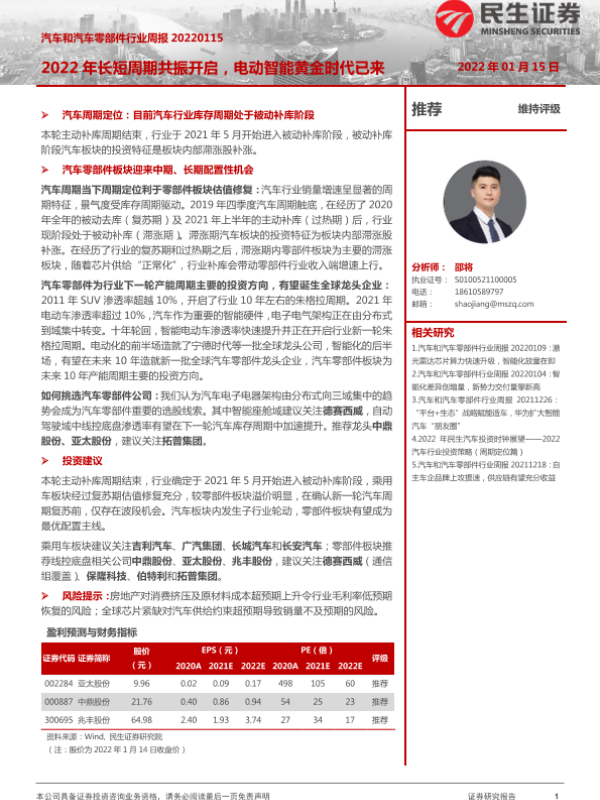 【民生证券】【20220115】汽车和汽车零部件行业周报:2022年长短周期共振开启,电动智能黄金时代已来-29页 行业研究
