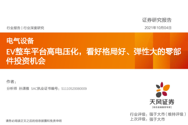 【天风证券】【20211004】电气设备行业深度研究:EV整车平台高电压化,看好格局好、弹性大的零部件投资机会-49页 行业研究